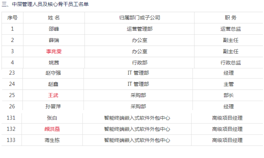 与王武相同的是,“李兆雯”的名字也出现在了润和软件2014年限制性股票激励计划激励对象名单中,职务为“办公室副主任”。此外,这份名单中还有“颜洪燕”的名字,其职务为“智能终端嵌入式软件外包中心高级项目经理”。