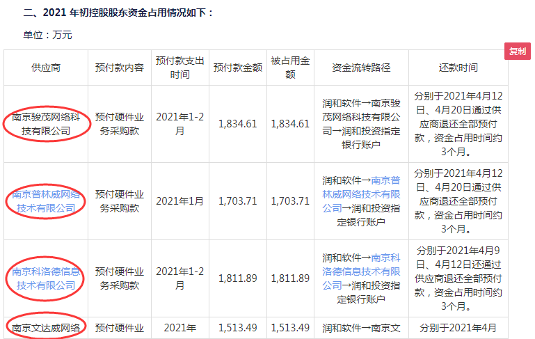 2021年初,润和投资通过四家公司一共占用上市公司资金超过6800万元