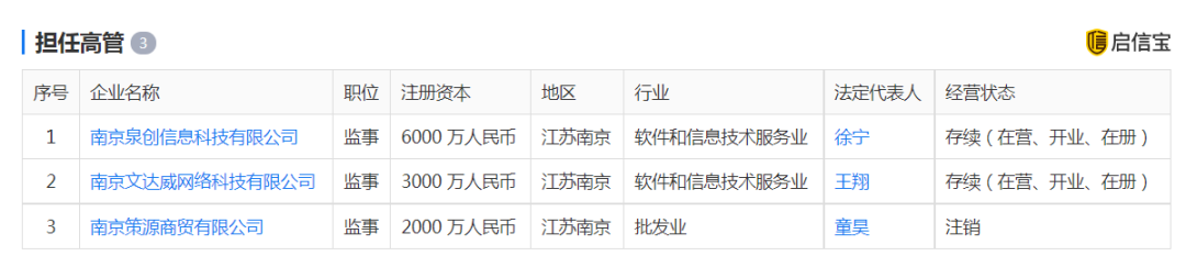 启信宝信息显示,文达威股东为王翔,监事即为卞岩。而卞岩同时也是南京泉创信息科技有限公司(以下简称南京泉创)、南京策源商贸有限公司(已注销,以下简称南京策源)的监事。